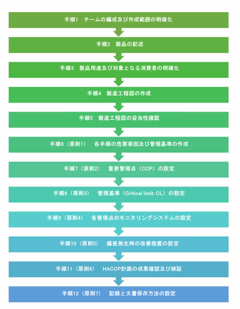 HACCPすなわち危害分析・重要管理点システムとは、食品製造についていえば、主に、消費者に影響を及ぼす食品製造による危害を防止するものです。現在(Revision 2020(9) )では、危害は4種類に分類されています。列挙すると、物理的危害(金属屑、ガラス屑、異物の汚染等)、化学的危害(洗剤、潤滑剤、汚染化学物質、所定の量を超える食品添加物、原材料中の抗生物質等)、生物学的危害(病原バクテリア又は毒素を生成するバクテリアの二次汚染等)、及び、アレルゲンによる危害となります。HACCPの概要は、次の図に示す7原則12手順の構成となります。